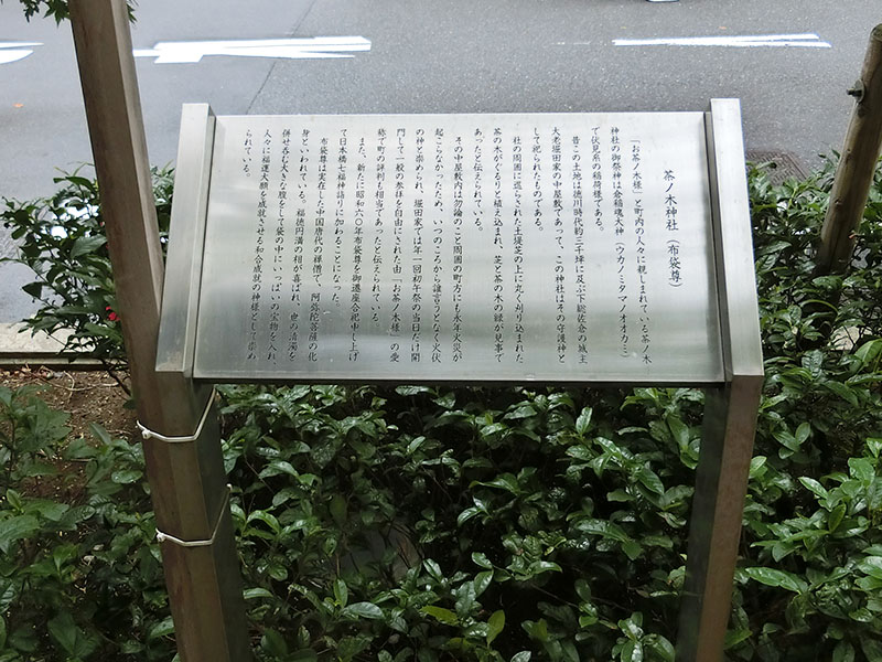 読み方は「ちゃのきじんじゃ」です。かつてこの地には下総国佐倉藩の堀田家の中屋敷があり、その屋敷神としてお祀りされていた神社です。社の周りには見事な茶の木が植えられていたことから、お茶ノ木様と称されるようになりました。日本橋七福神の布袋尊の神社でもあります。水天宮前駅が最寄り駅です。