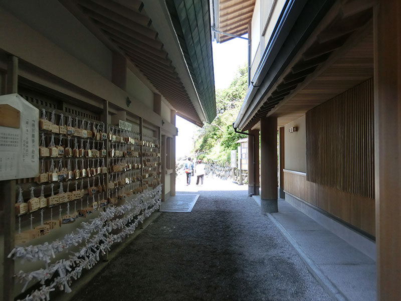 左前方に夫婦岩を見つつ、拝殿へと進みます。右の建物は社務所です。