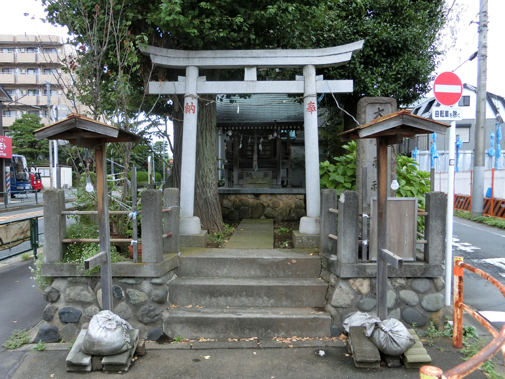 その道中でした。連雀通りを西へと歩き、新武蔵境通りとの交差点を越えてすぐ、大きなイチョウの木が見えまして、その足元には石鳥居があるではないですか。