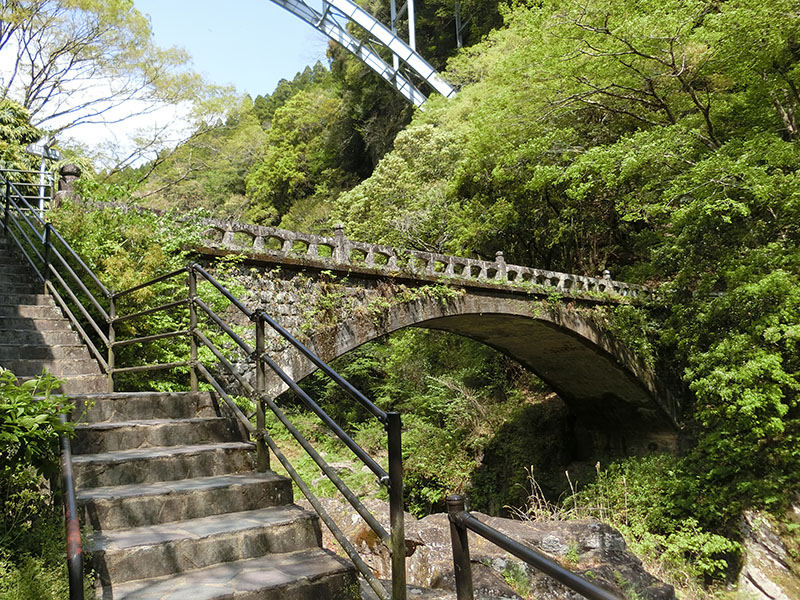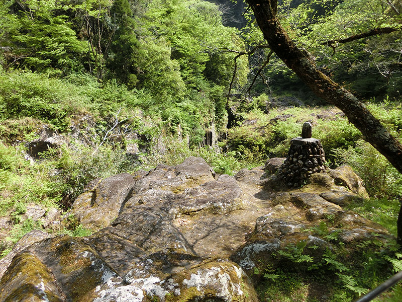 階段を下りて行きますと、左手には石碑。その先が五ヶ瀬川の渓谷です。