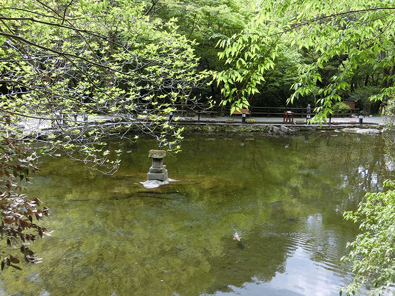 池の中、石祠のある島が「おのころ島」です。イザナギとイザナミによる国生みで最初に造られた島とされています。高千穂神社の春祭では、お神輿がこの池に入り島を三周して禊をするそうです。